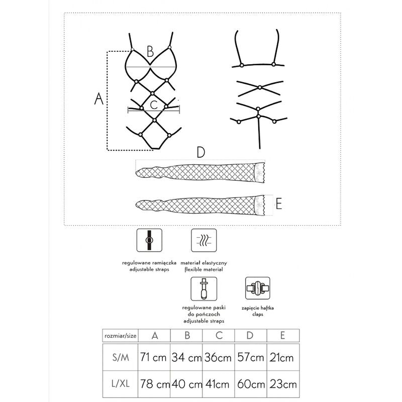 Setets överdel består av sexiga svarta ränder, sammanflätade på magen och sammanbundna med ringar. Axelbanden upptill omsluter elegant bysten utan att täcka den, medan de nedtill försiktigt förvandlas till en stringtrosa. Separata axelband löper ner längs båda sidor av stringtrosan och kramar charmigt om höfterna. Den nedre delen av setet består av svarta strumpor med justerbar längd, tillverkade av mesh. Strumporna är fästa med spännen till det övre elementet av outfiten, fram och bak.